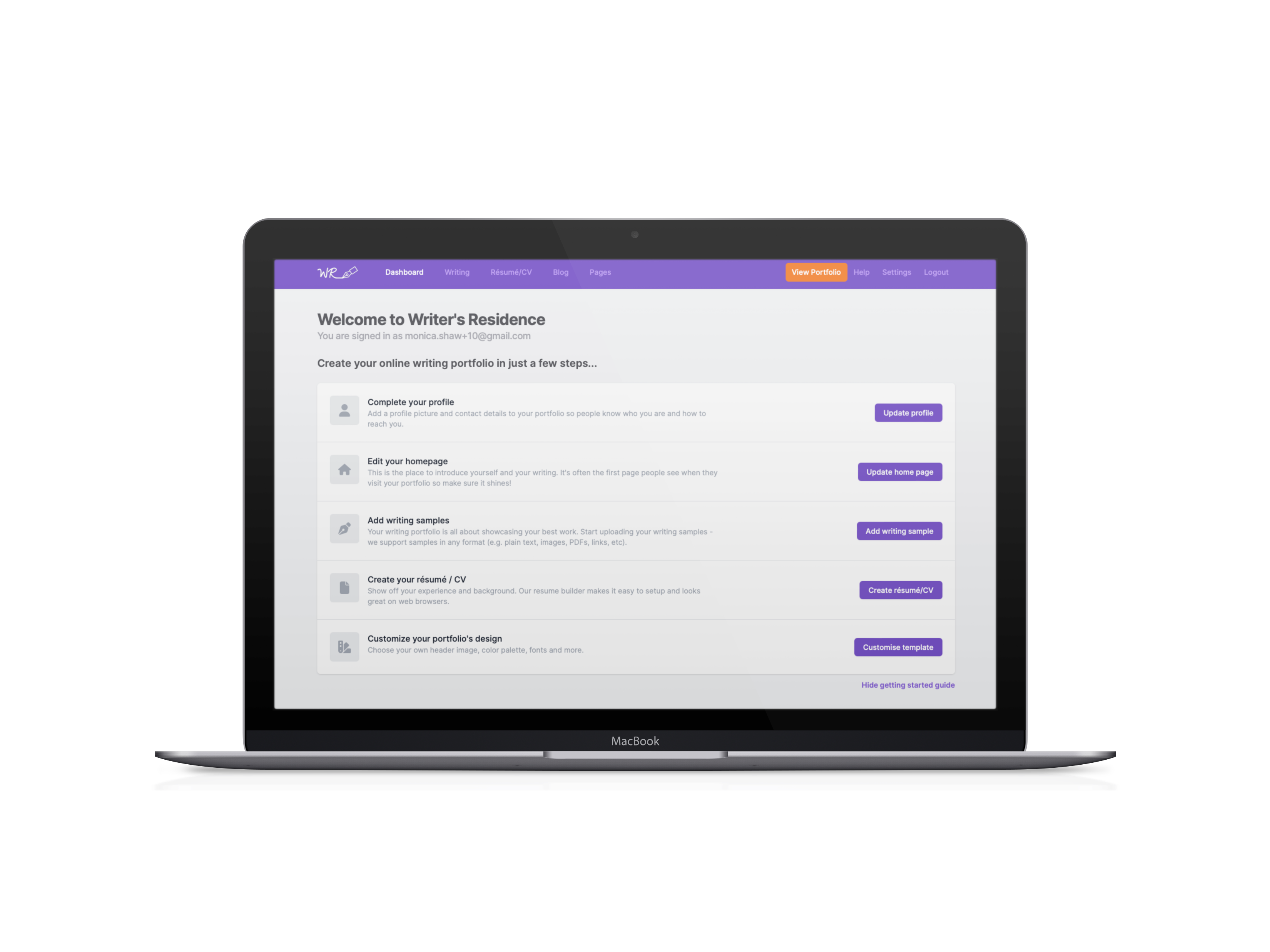 - Get your unique url <yourname>.writersresidence.com so people can find you.